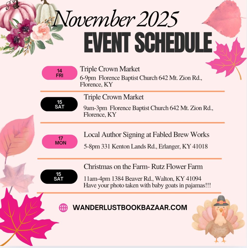 November is packed with cozy markets, local flavor, and bookish fun! We’re spending a weekend at the Triple Crown Market in Florence. Then mid-month we’ll be spending some time with some of my faves doing something extra special — a Local Author Signing at Fabled Brew Works in Erlanger! Finally, we’re wrapping up the month with Christmas on the Farm— come have your photo taken with baby goats!! Mark your calendars, grab your favorite fall drink, and come wander with us all month long.