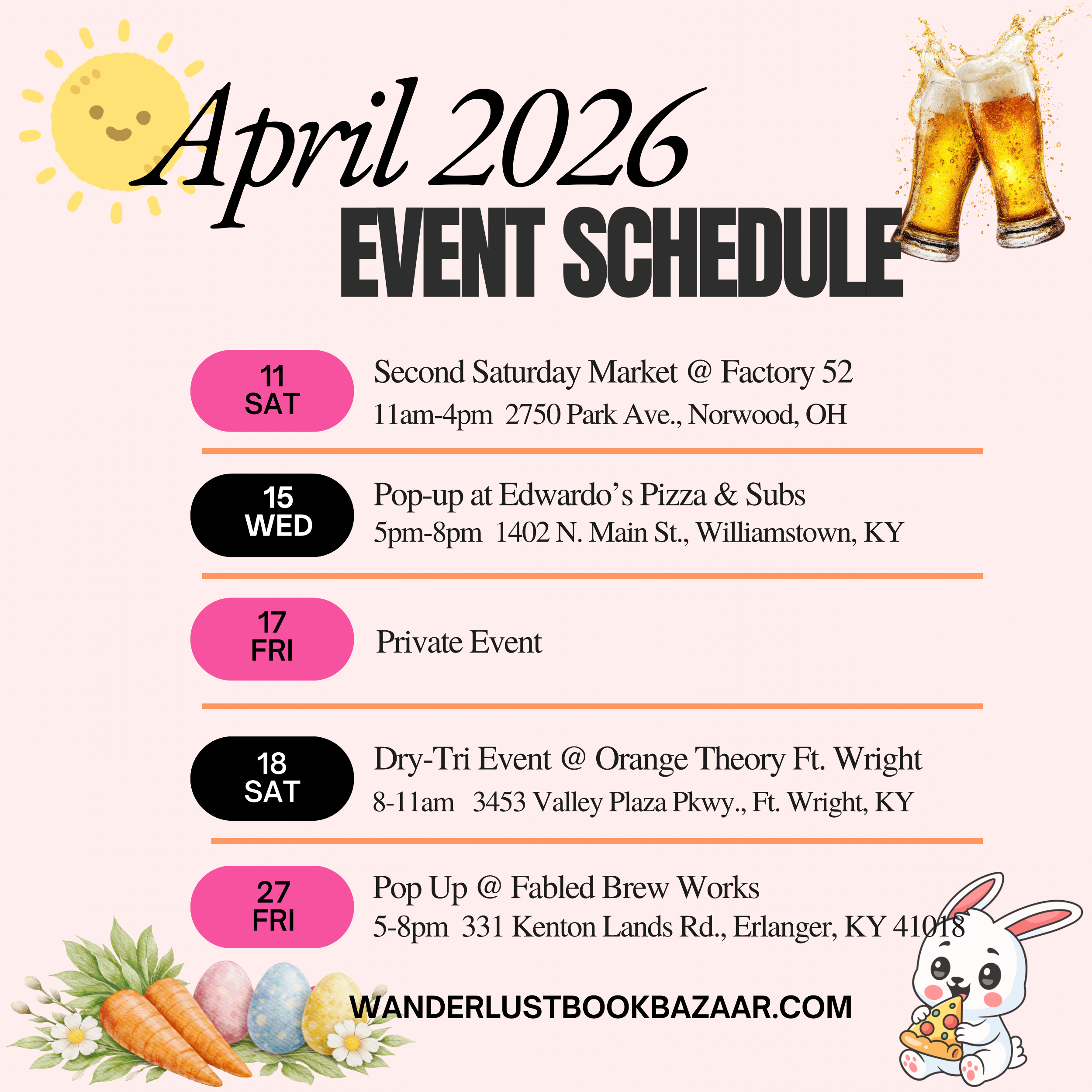 April is a busy and exciting month for our Wanderlust! 🌷📚 We’ll be popping up at a variety of events across the region—from vibrant markets and community gatherings to private events—bringing a thoughtfully curated selection of books right to you. Whether you’re hunting for your next great read, a unique gift, or just want to browse in a cozy, welcoming space, we’d love to see you.